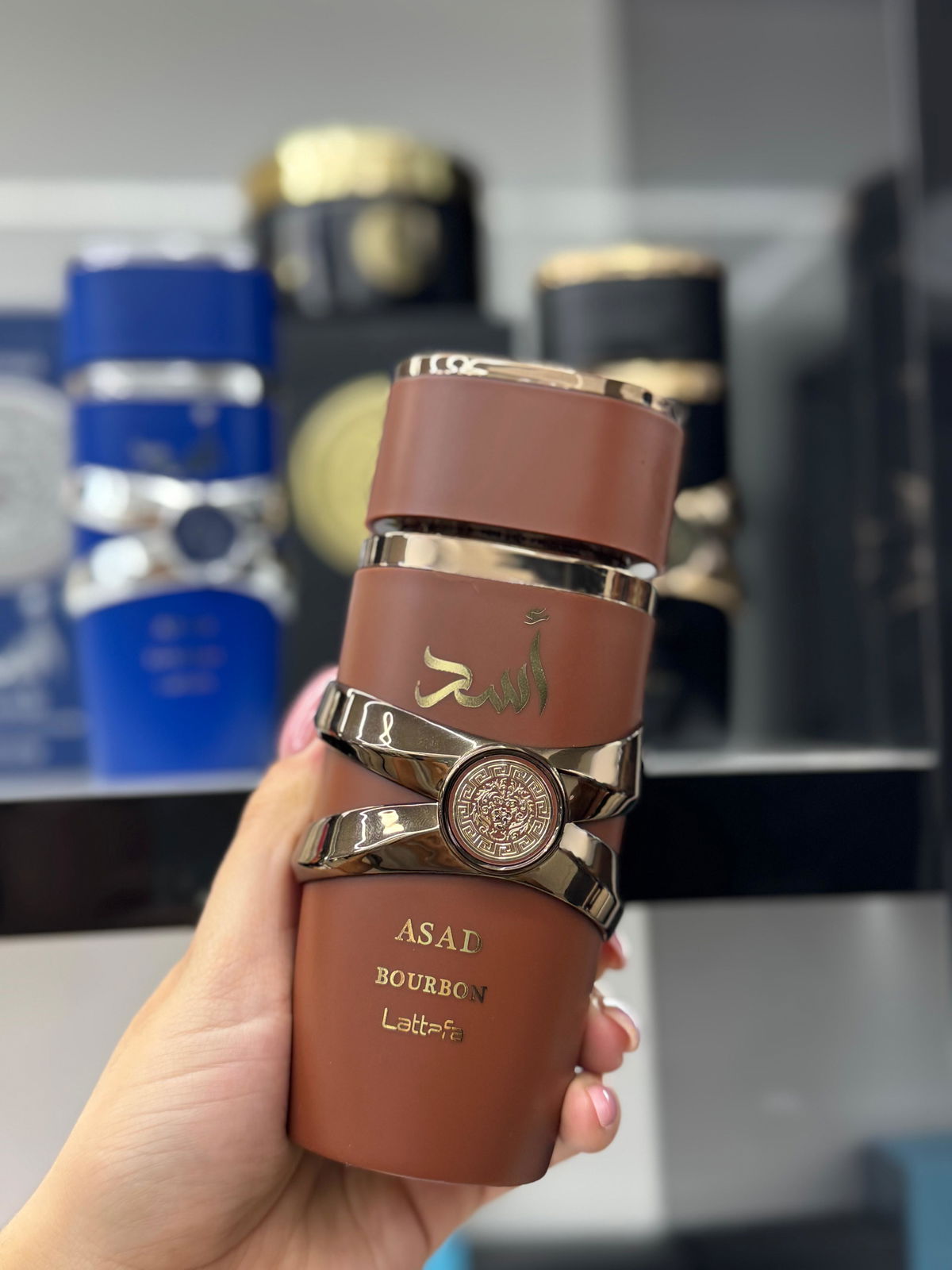 Asad Bourbon de Lattafa Perfumes es una fragancia de la familia olfativa Oriental Especiada para Hombres. Esta fragrancia es nueva. Asad Bourbon se lanzó en 2025. Las Notas de Salida son lavanda, ciruela Mirabel y pimienta rosa; las Notas de Corazón son cacao, nuez moscada y Davana; las Notas de Fondo son vainilla Bourbon, ámbar y vetiver.