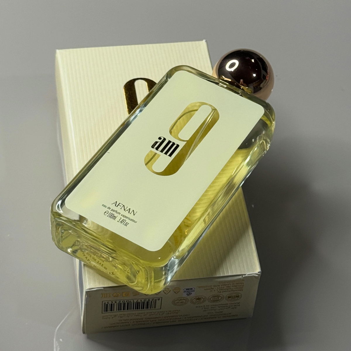 9am de Afnan es una fragancia de la familia olfativa para Mujeres. Las Notas de Salida son limón (lima ácida), mandarina, cardamomo y pimienta rosa; las Notas de Corazón son lavanda, flor de azahar del naranjo, manzana verde y rosa; las Notas de Fondo son almizcle, musgo, cedro y pachulí.