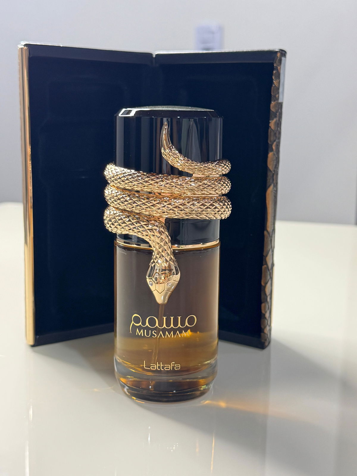 Musamam de Lattafa Perfumes es una fragancia de la familia olfativa Amaderada Aromática para Hombres y Mujeres. Esta fragrancia es nueva. Musamam se lanzó en 2022. Las Notas de Salida son azafrán, lavanda y mandarina italiana; las Notas de Corazón son Amberwood, cedro de Virginia y geranio; las Notas de Fondo son Akigalawood, incienso y ládano.