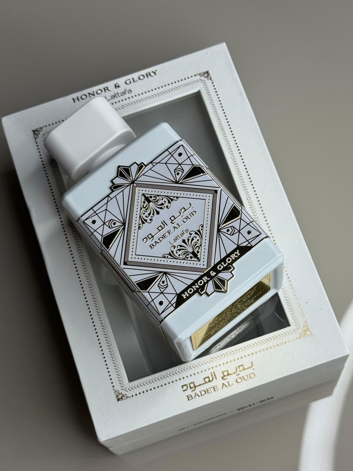 Bade'e Al Oud Honor & Glory de Lattafa Perfumes es una fragancia de la familia olfativa para Hombres y Mujeres. Esta fragrancia es nueva. Bade'e Al Oud Honor & Glory se lanzó en 2023. Las Notas de Salida son piña y créme brulée; las Notas de Corazón son canela, cúrcuma (azafrán de la India), pimienta negra y benjuí; las Notas de Fondo son vainilla, sándalo, cachemira y musgo.
