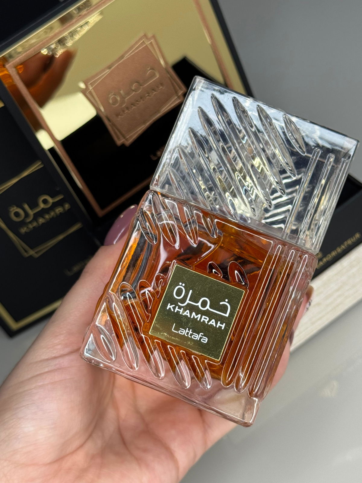 Khamrah de Lattafa Perfumes es una fragancia oriental especiada para mujer y hombre. Esta nueva fragancia se lanzó en 2022. Sus notas de salida son canela, nuez moscada y bergamota; sus notas de corazón son dátiles, praliné, nardos y mahonial; y sus notas de fondo son vainilla, haba tonka, Amberwood, mirra, benjuí y madera de akigala.