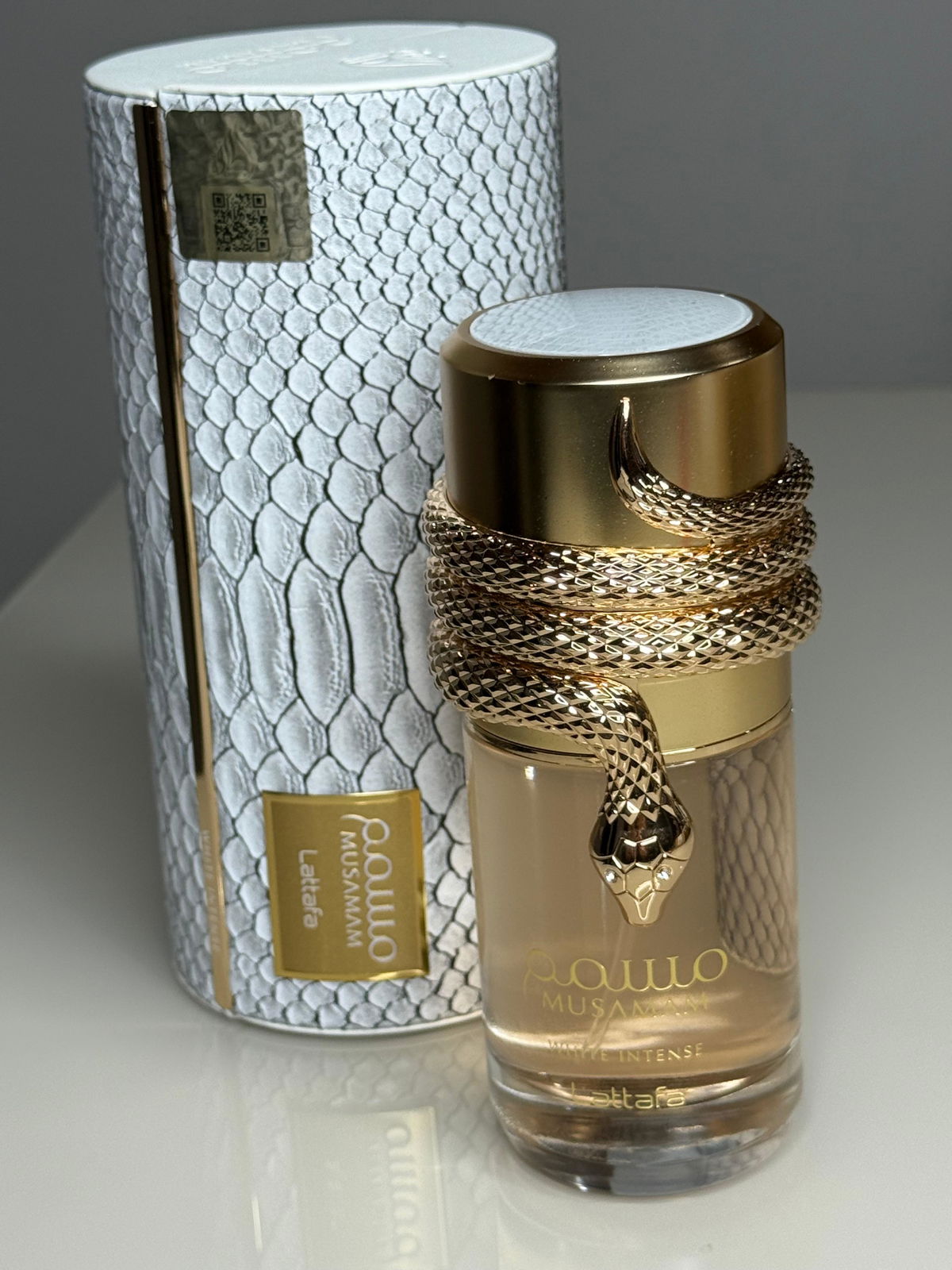 Musamam White Intense de Lattafa Perfumes es una fragancia de la familia olfativa Oriental Floral para Hombres y Mujeres. Esta fragrancia es nueva. Musamam White Intense se lanzó en 2023. La Nariz detrás de esta fragrancia es Gaël Montero. Las Notas de Salida son especias, bergamota y naranja; las Notas de Corazón son coco, ylang-ylang, ambroxan y Mahonial; las Notas de Fondo son sándalo, almizcle y benjuí.